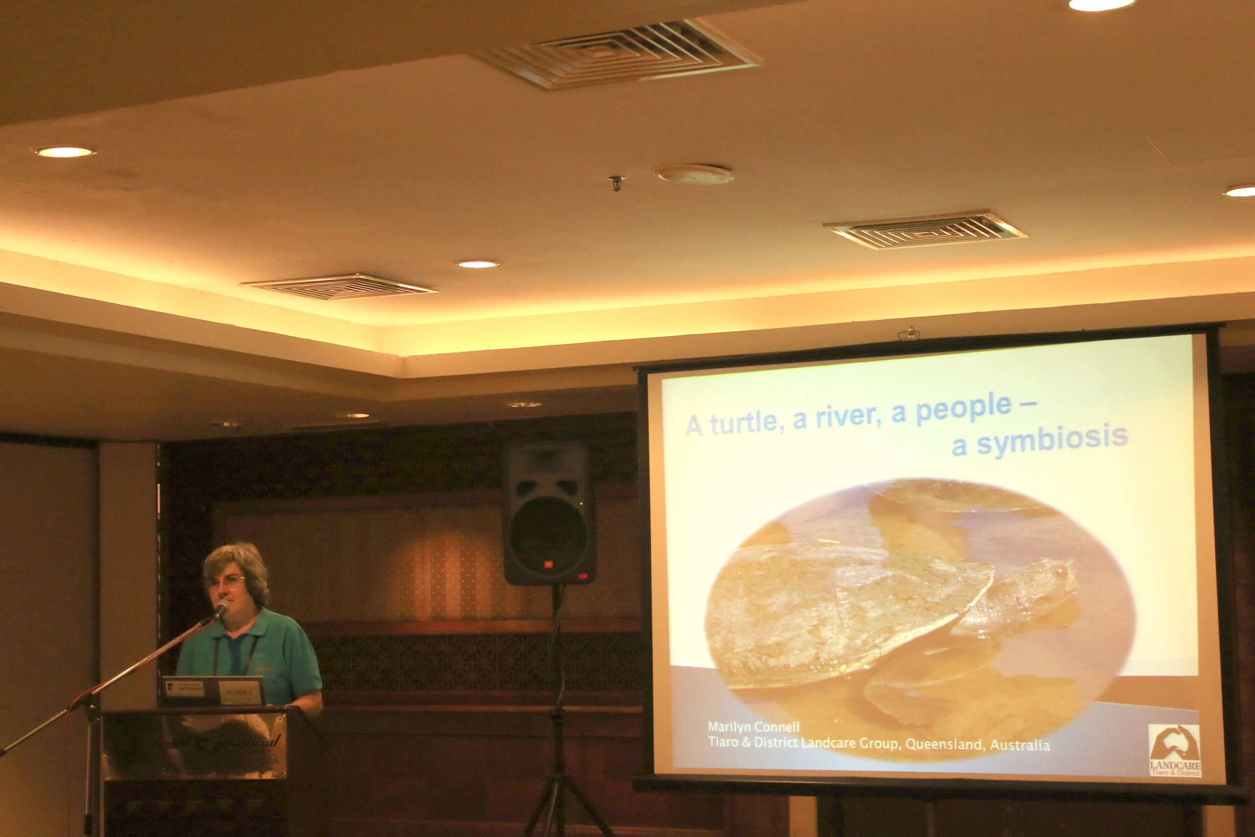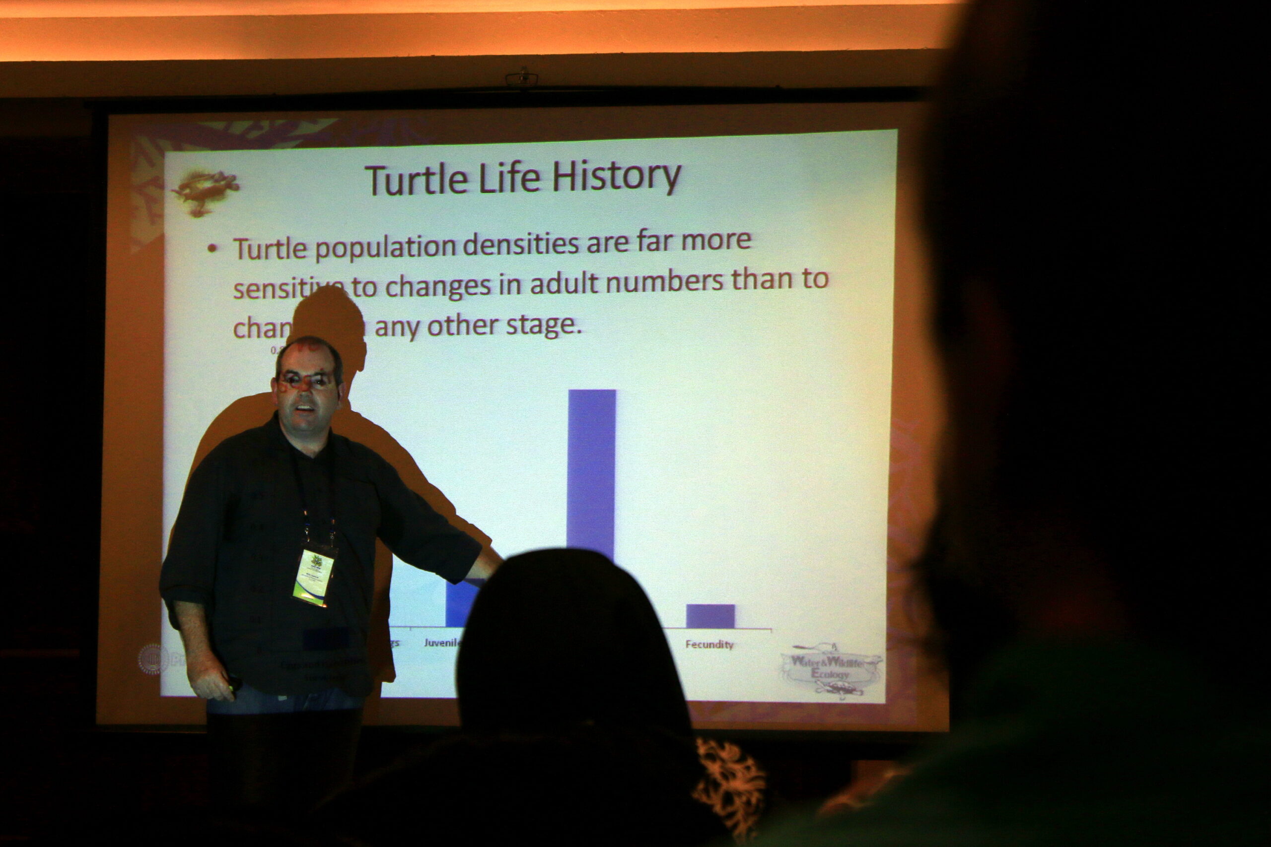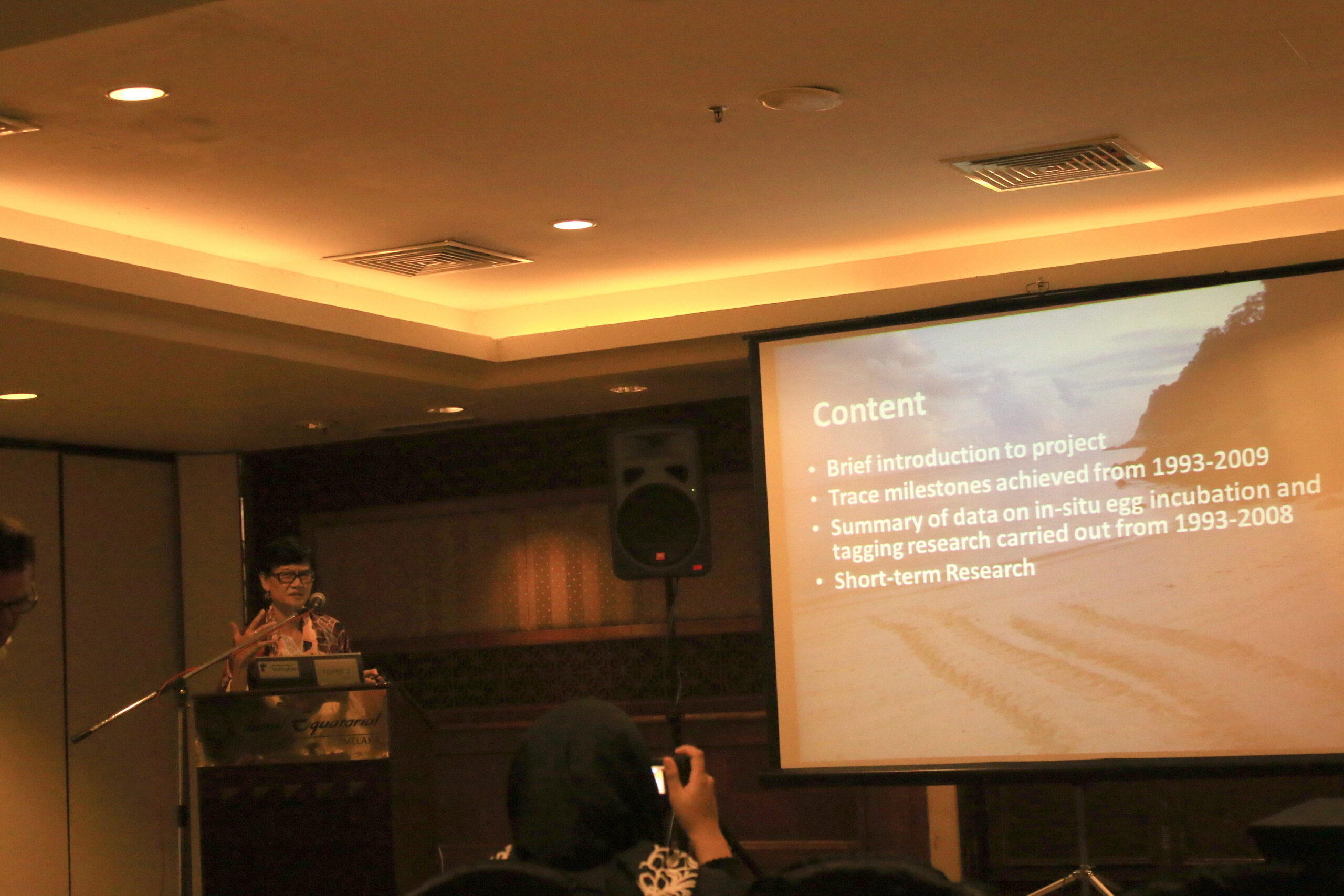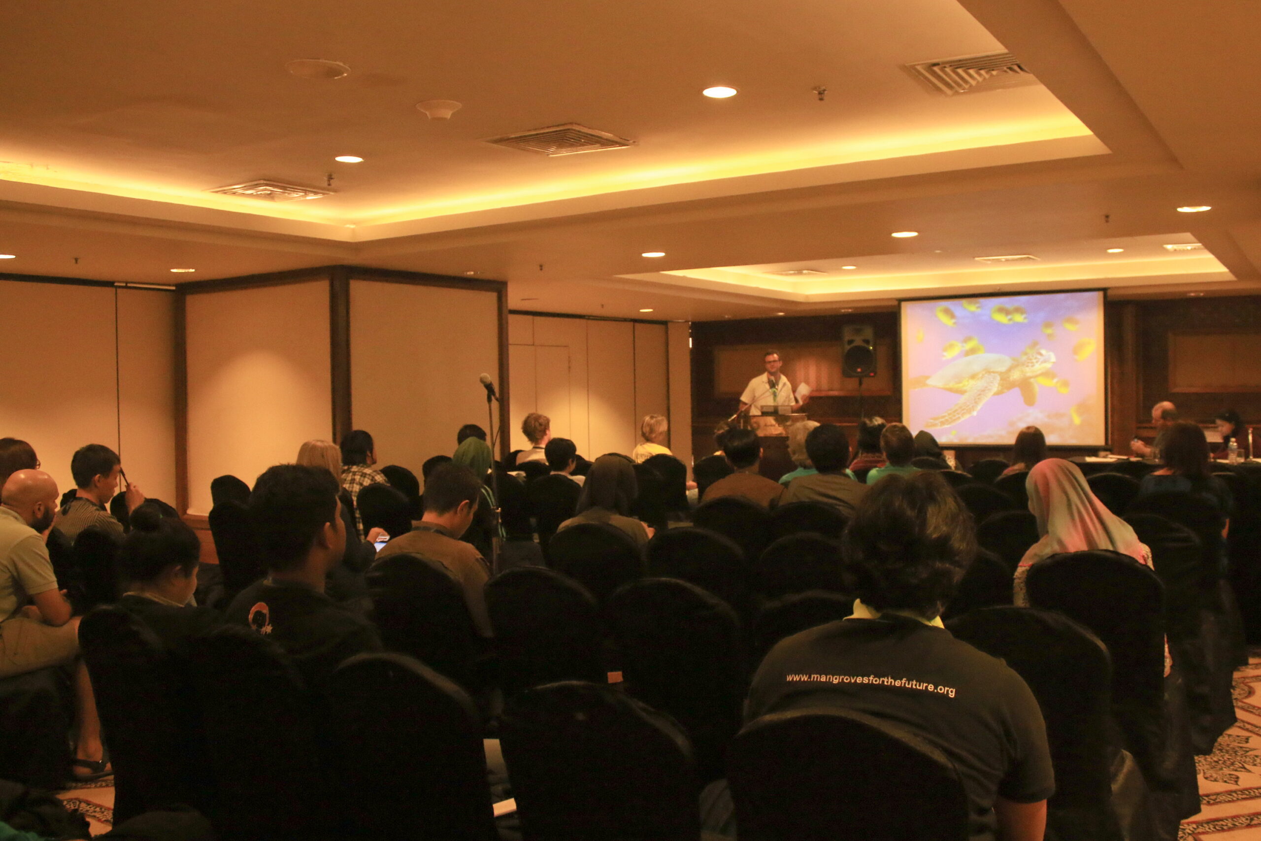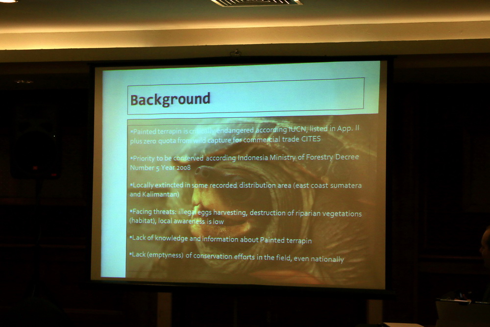 In the presentation, Joko explained the background of why the conservation of Painted terrapin (Batagur borneoensis) must be saved in Indonesia, what have been done to save this critically endangered species, the results have achieved and the challenges to be faced in the future, included the actions must be taken to reforest the habitat, riparian vegetations, mangroves that had been converted to oil palm and farming.